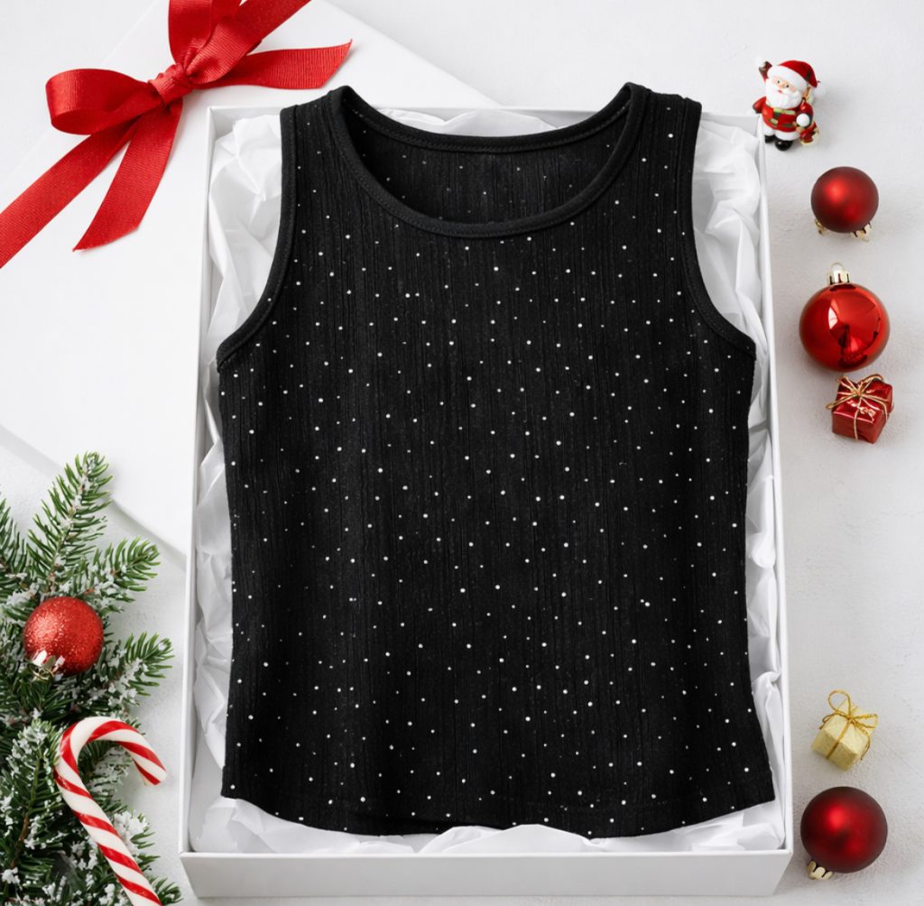 - : جنس تاپ، کریشه است. نگین های روی تاپ، چسبی می باشد. تاپ یقه گرد و آستین حلقه ای است.